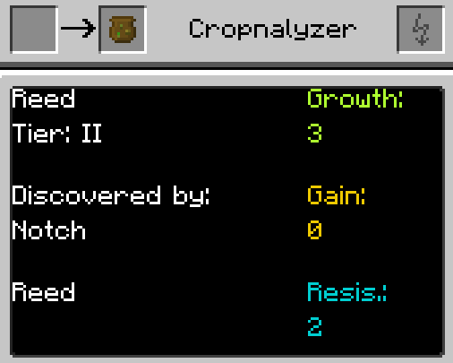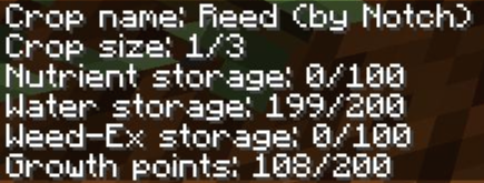 거의 다 자라거나 다 자란 작물을 좌클릭하여 수확하면 씨앗 주머니unknown seedbag가 나오는데, 허공에 작물 분석기를 우클릭하여 나타난 GUI 왼쪽 상단 칸에 넣으면 다음과 같은 정보를 제공합니다. 총 4회에 걸쳐 사용합니다.