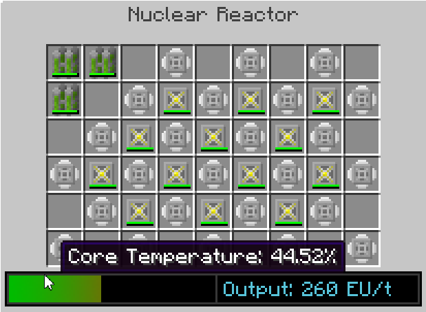 연료봉이 핵 반응로 내에 있고 레드스톤 신호가 입력되면 연료를 소모하며 발전을 시작할 것입니다. 발전량은 다음과 같습니다.