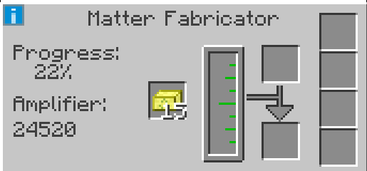 UU-물질 1mB을 제작하는데에 1,000,000EU를 소모합니다. 최대 입력 전력은 512EU/tick입니다.