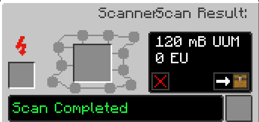 스캔이 완료되면, 다음과 같이 몇 mB의 UU-물질과 전력이 필요한지 알 수 있습니다. 상자 버튼을 눌러 패턴을 저장해야 하하는데, 패턴 저장소가 필요합니다.