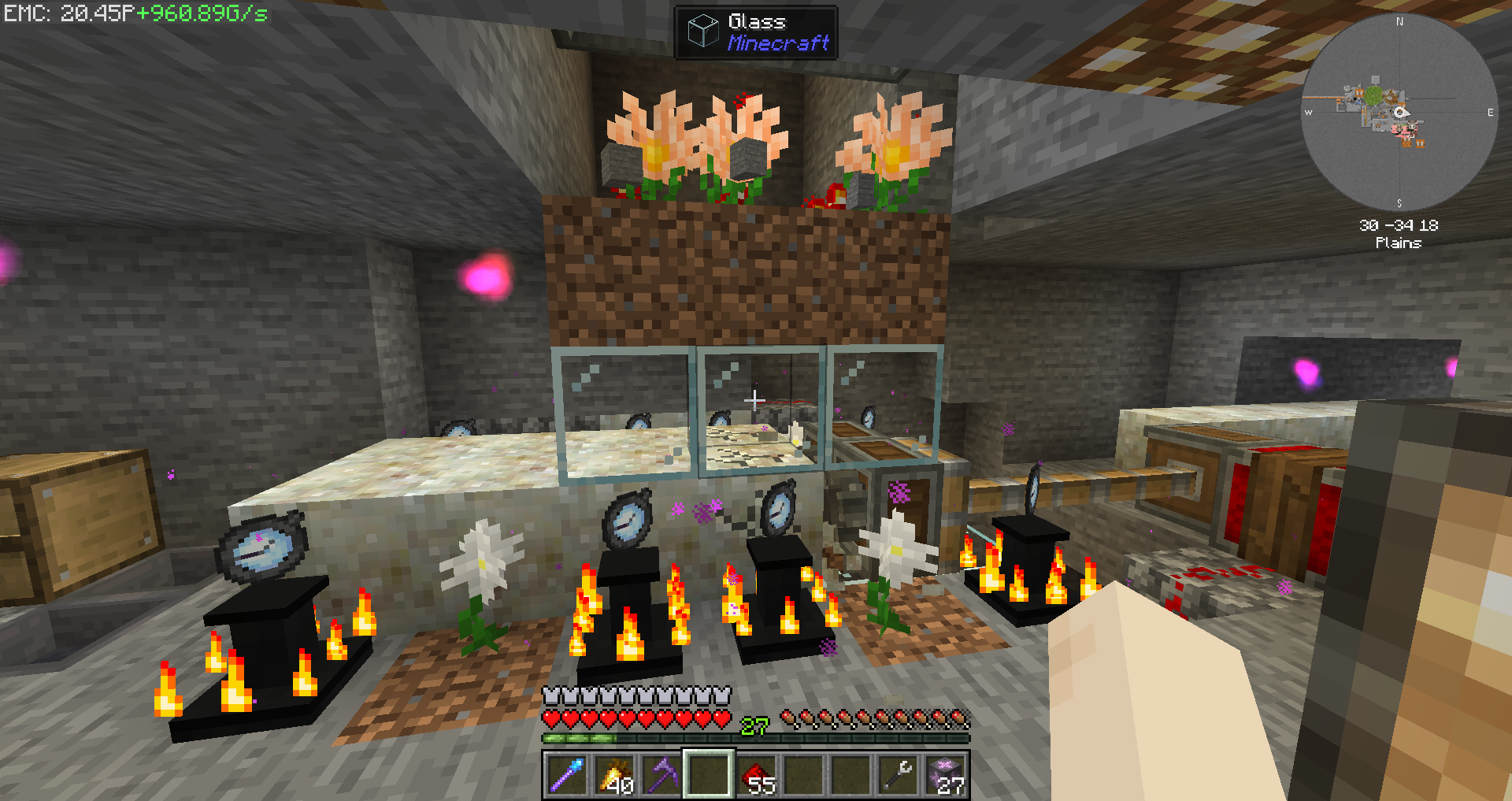 불먹이꽃 8개에 200Ticks로 작동하는 발사기로 석탄을 공급해주고 있습니다. 꽃 하나 당 40초 (800ticks)의 연소 시간을 가지고 있습니다.