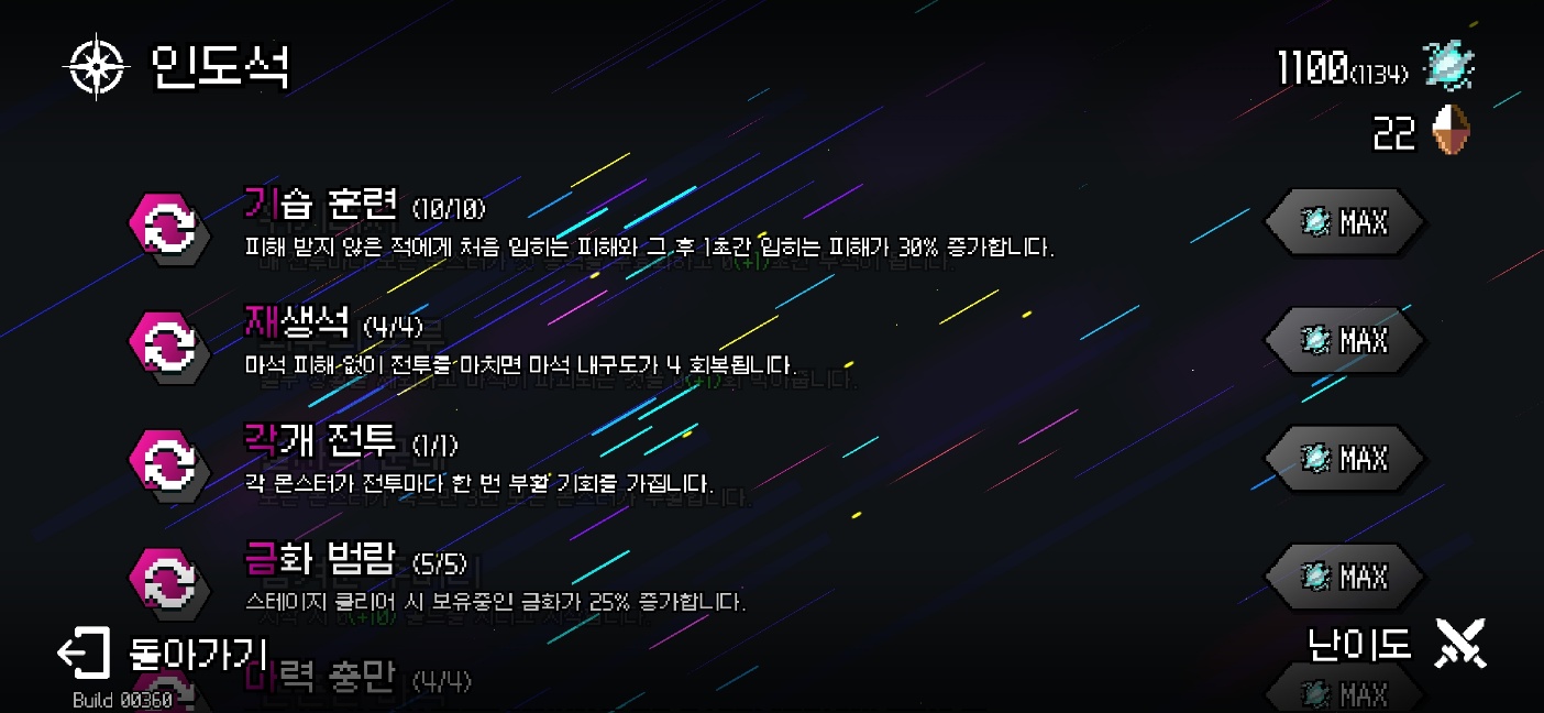 | 금화 범람 | 스테이지 클리어 시 보유중인 금화가 (5 * lv)% 증가합니다. | 5 | 15 > 30 > 60 > 120 > 240 |