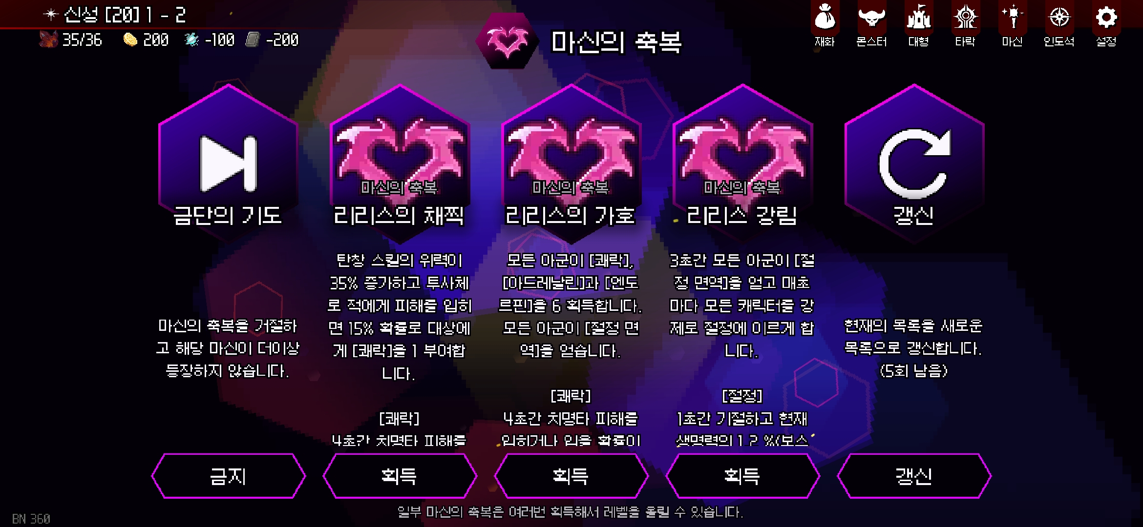 마신의 축복은 전투 재화 선택으로 얻을 수 있으며, 세 선택지 중 하나를 획득할 수 있습니다.