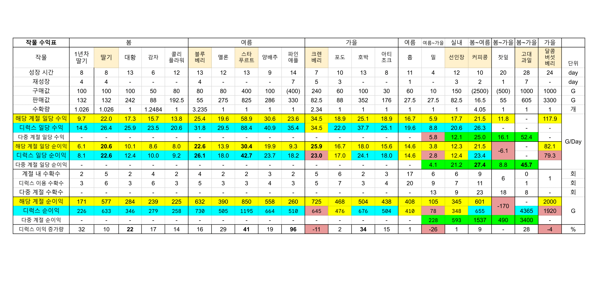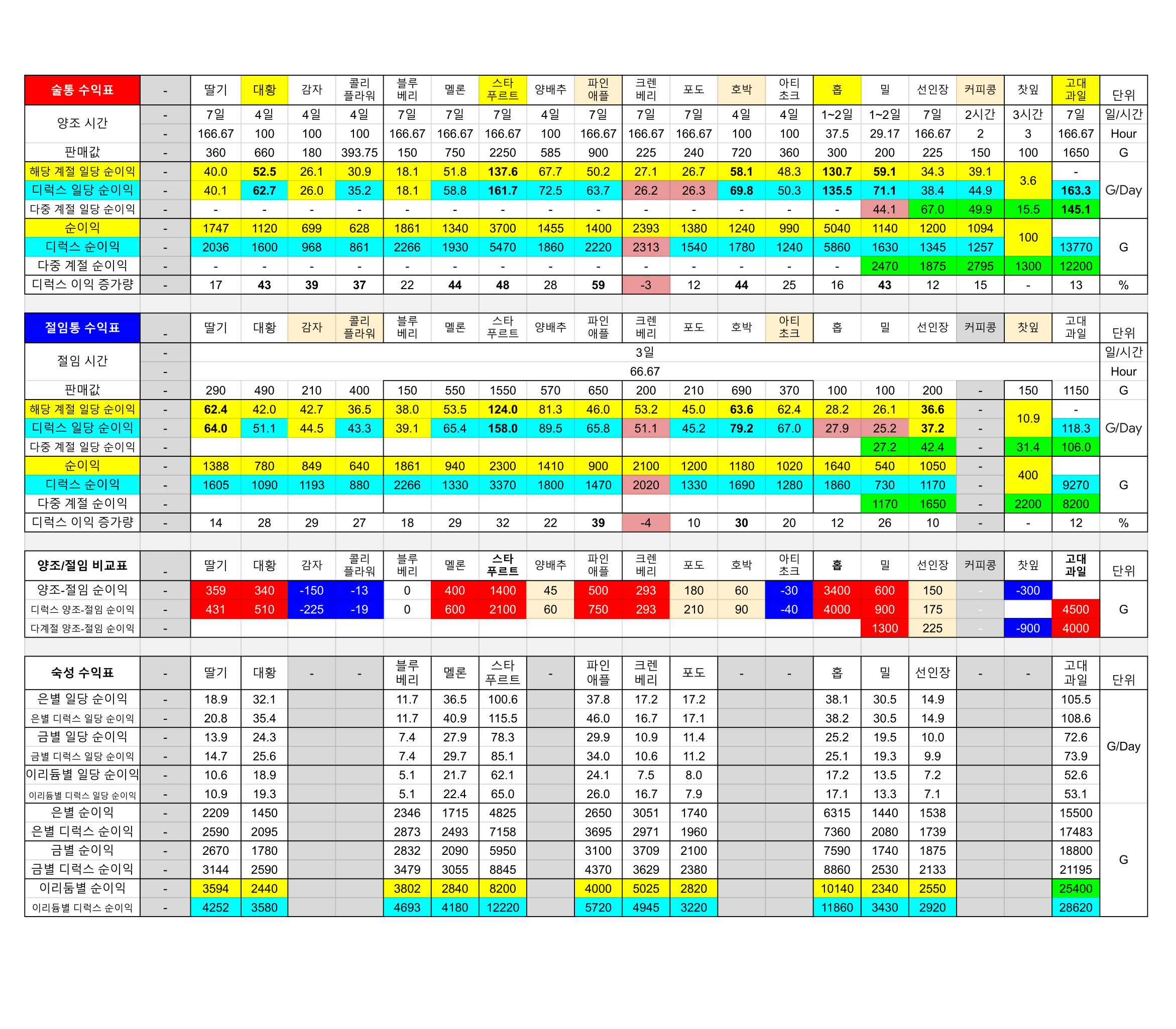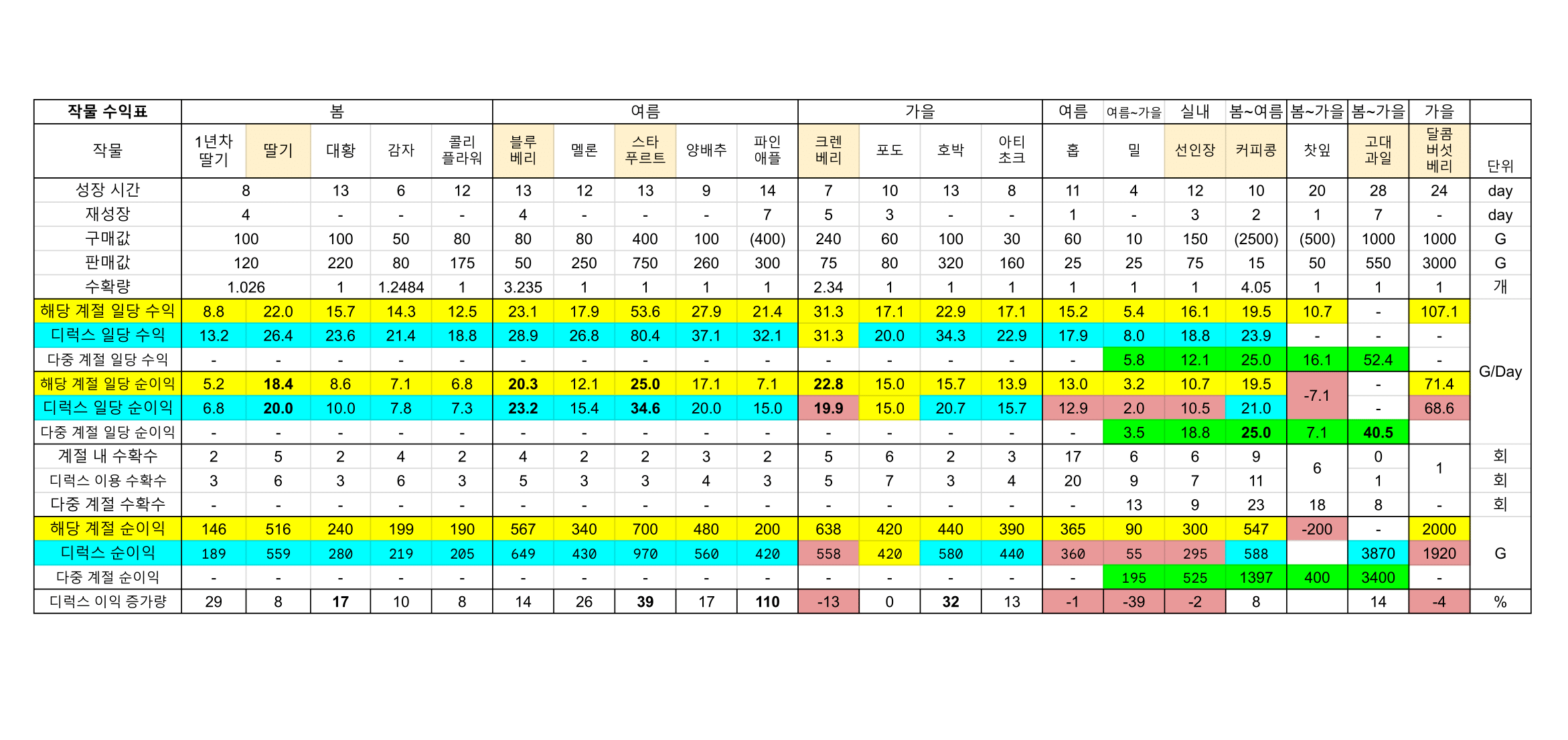 - 일부 작물 [판매값 < 씨앗 구매값]은 표에서 제외