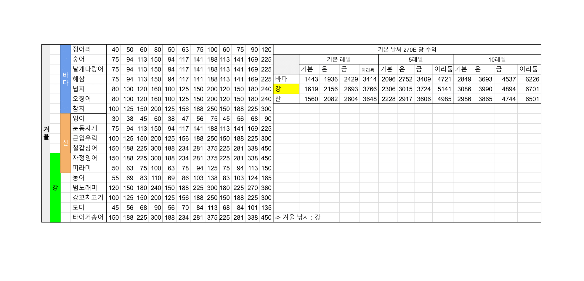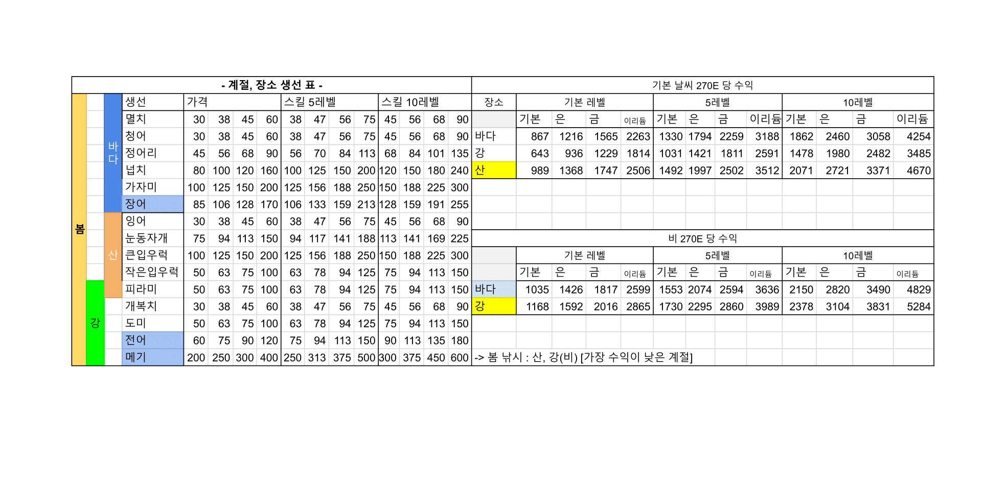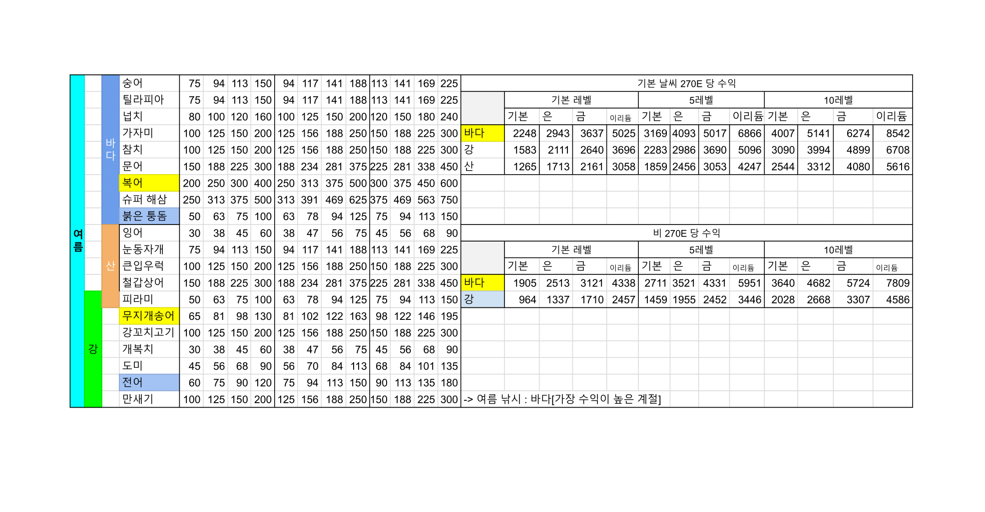우선 봄은 낚시 효율이 최저, 여름은 낚시 효율이 최고점을 가집니다.
