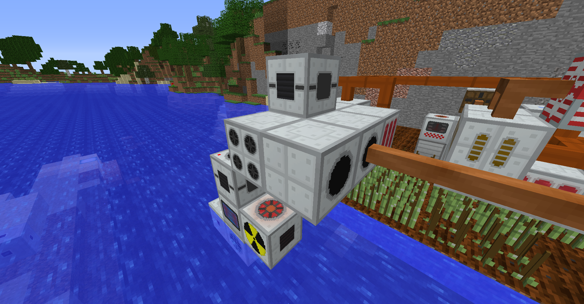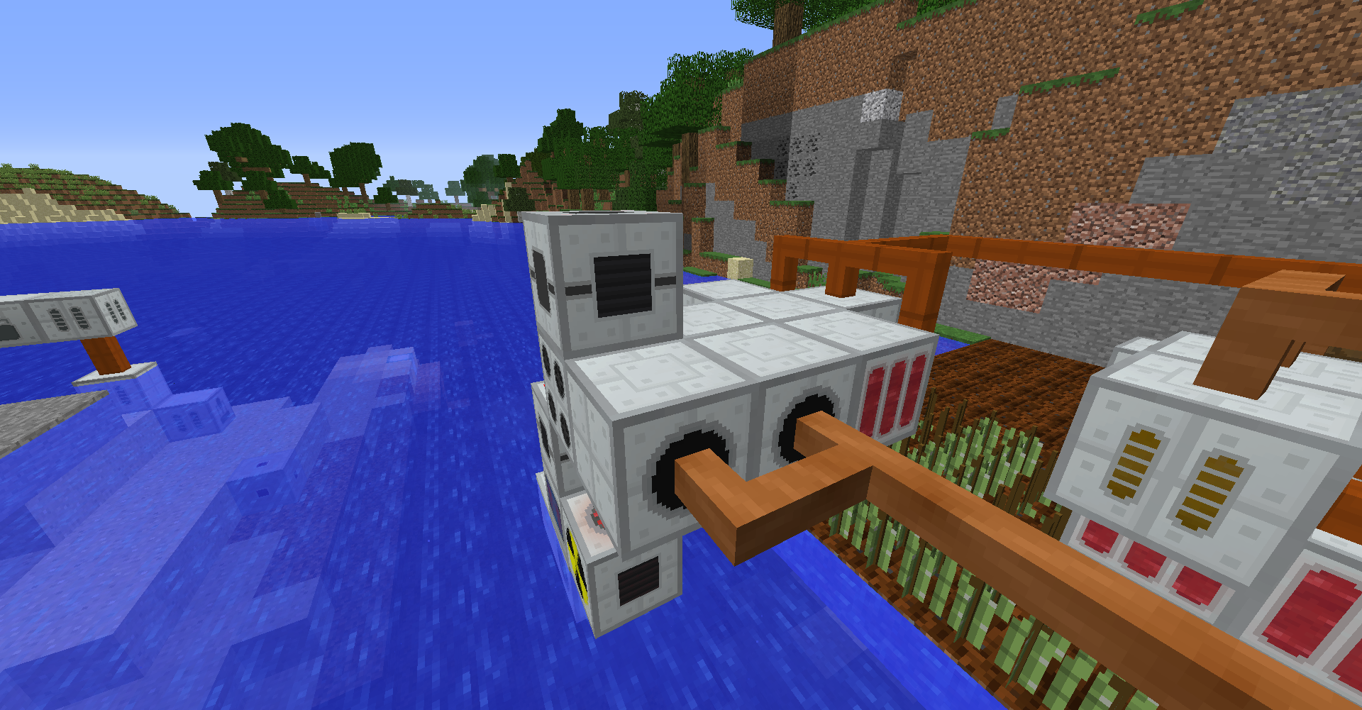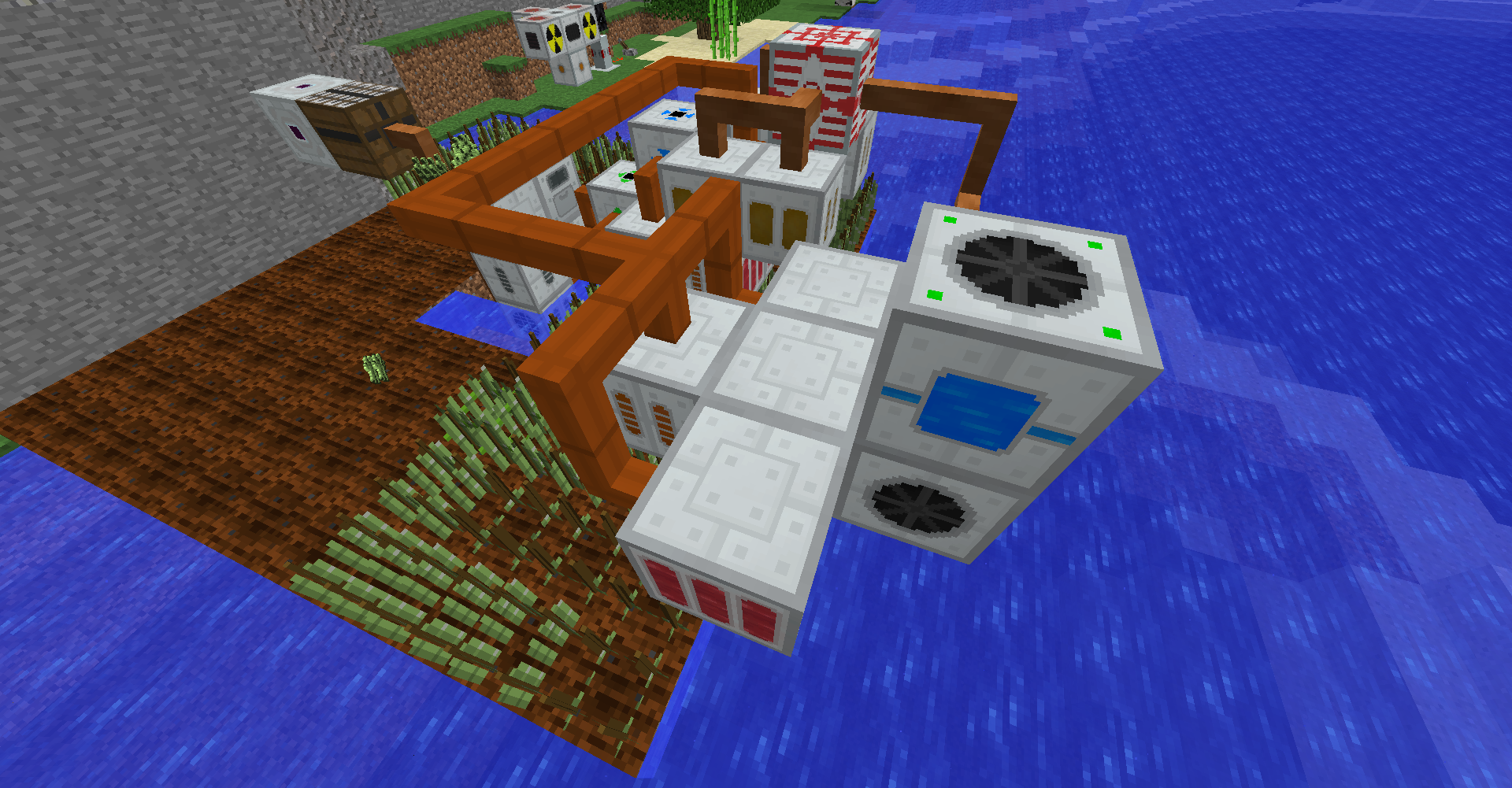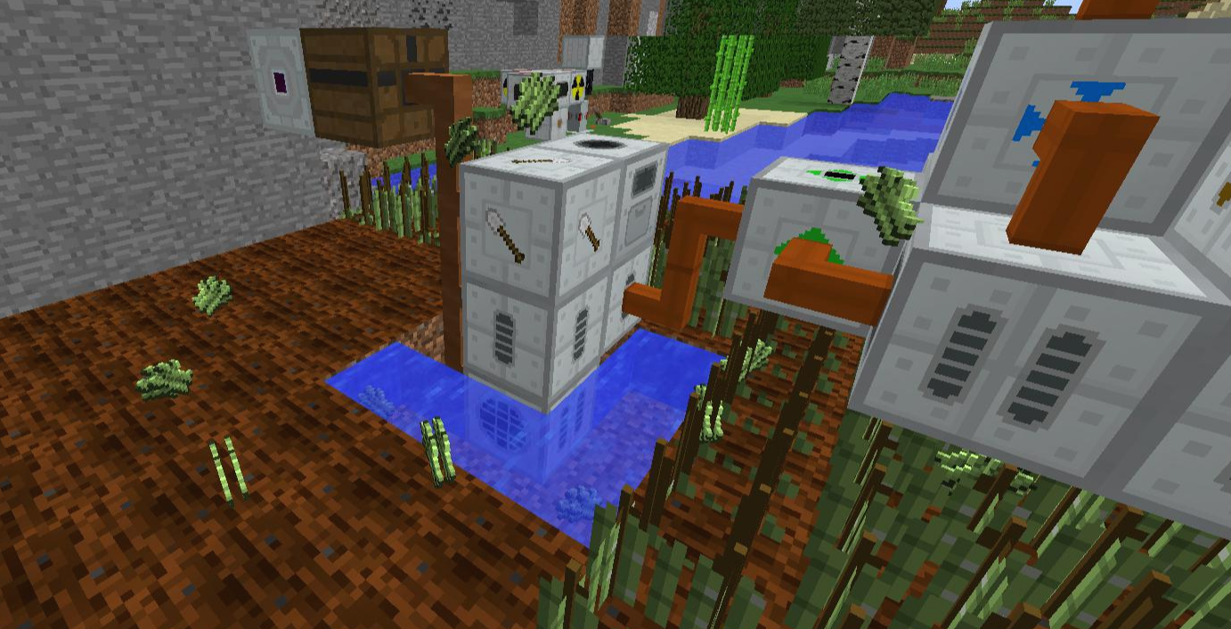 바이오 발전기에서 사용되는 연료인 사탕수수의 생산량이 소모량보다 높아서 위와 같이 아이템이 나뒹굴 때가 발생합니다. 작물 재배기에 든 이젝터를 가능한 방향으로 바꾼 뒤, 재활용기recycler를 옆에 두는 것으로 초과 생산량을 줄일 수 있긴 합니다.