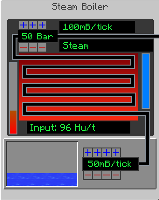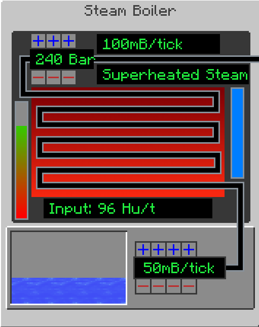 증기 발전에 의해 증기 100mb당 50EU를 생산하지만, 과열 증기를 이용한다면 과열 증기 100mb당 100EU+50EU로 150EU를 생산합니다! 심지어 메커니즘은 증기 발전과 똑같으니, 가능하다면 과열 증기를 하는 것이 좋겠습니다.