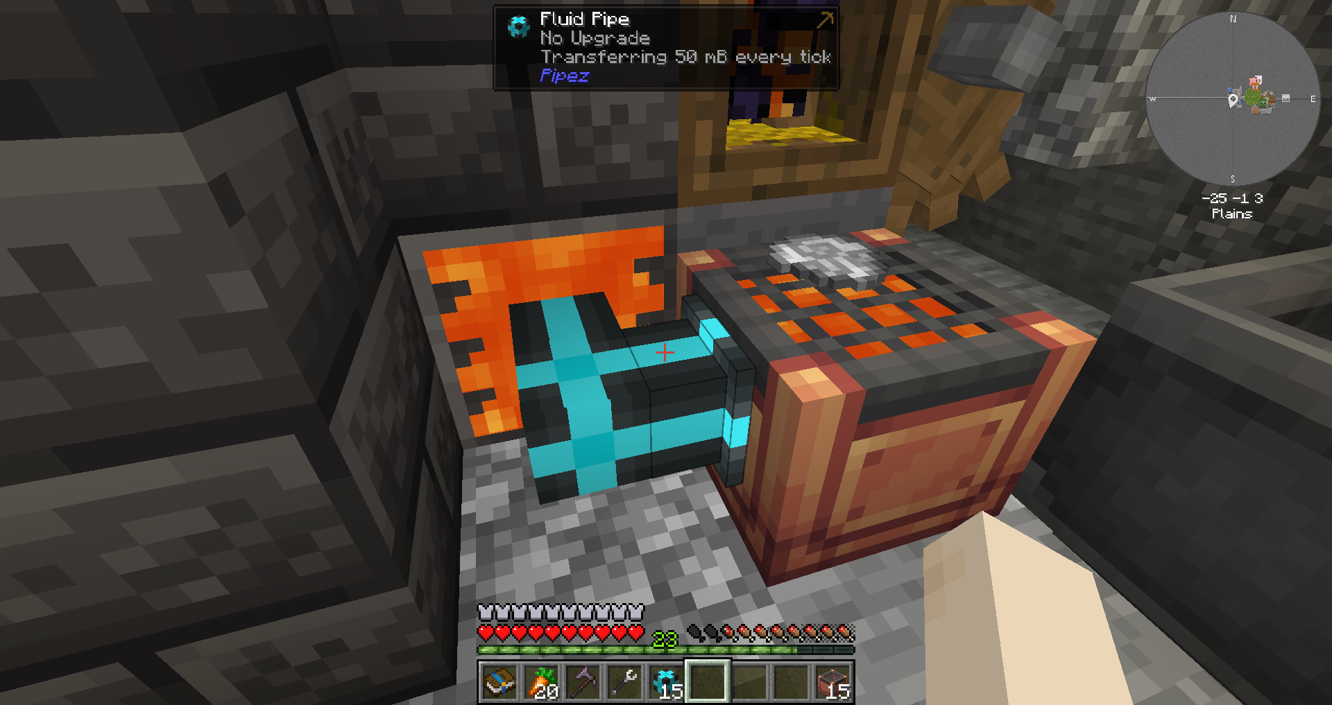 용암 닭이 생성하는 용암 알을 호퍼로 아이템 배수기에 연결하면, 배수기에 1,000mb의 용암을 저장시킵니다.