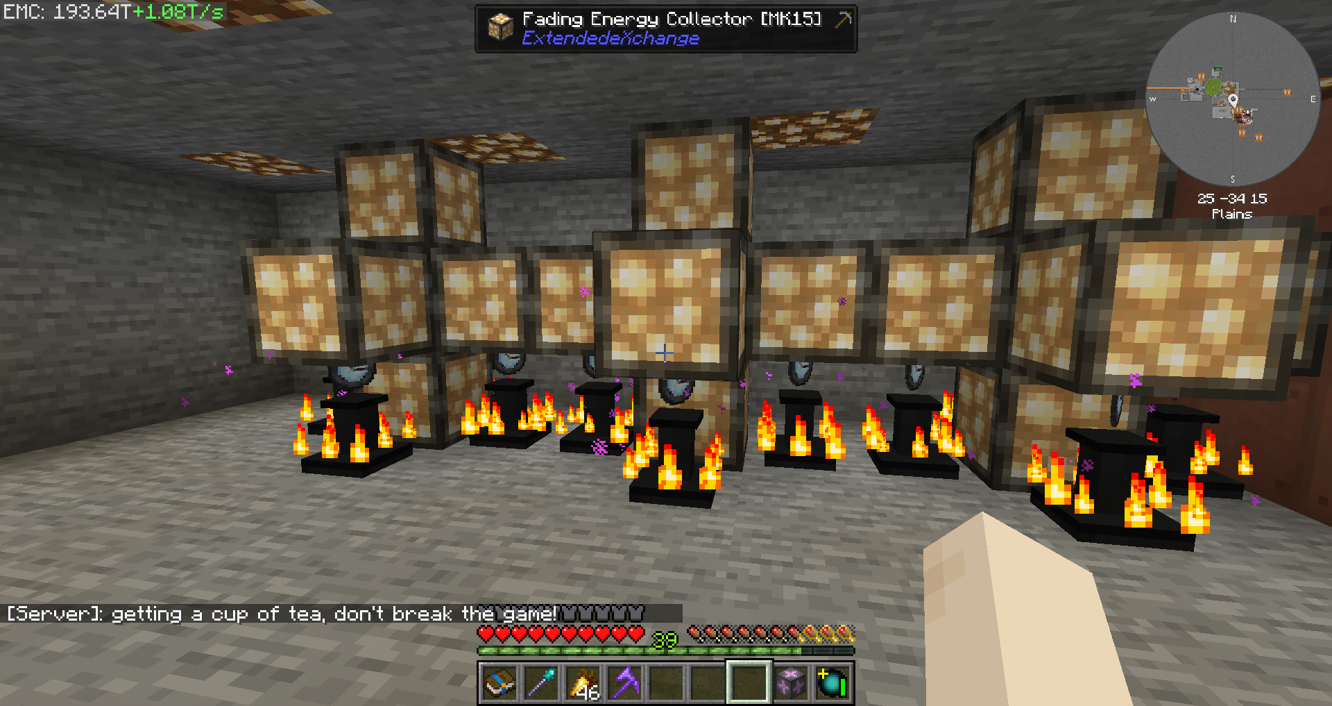 불먹이꽃 8개에 200Ticks로 작동하는 발사기로 석탄을 공급해주고 있습니다. 꽃 하나 당 40초 (800ticks)의 연소 시간을 가지고 있습니다.