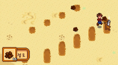 점토가 나타나면 숫자 순서대로 호미질을 하면 점토를 얻을 수 있습니다.