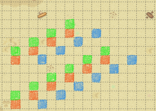 괭이질에 따라 사전 방향으로 밀집한 점토들이 오른쪽 2칸, 위 1칸 방향으로 이동하고 있음을 볼 수 있습니다.