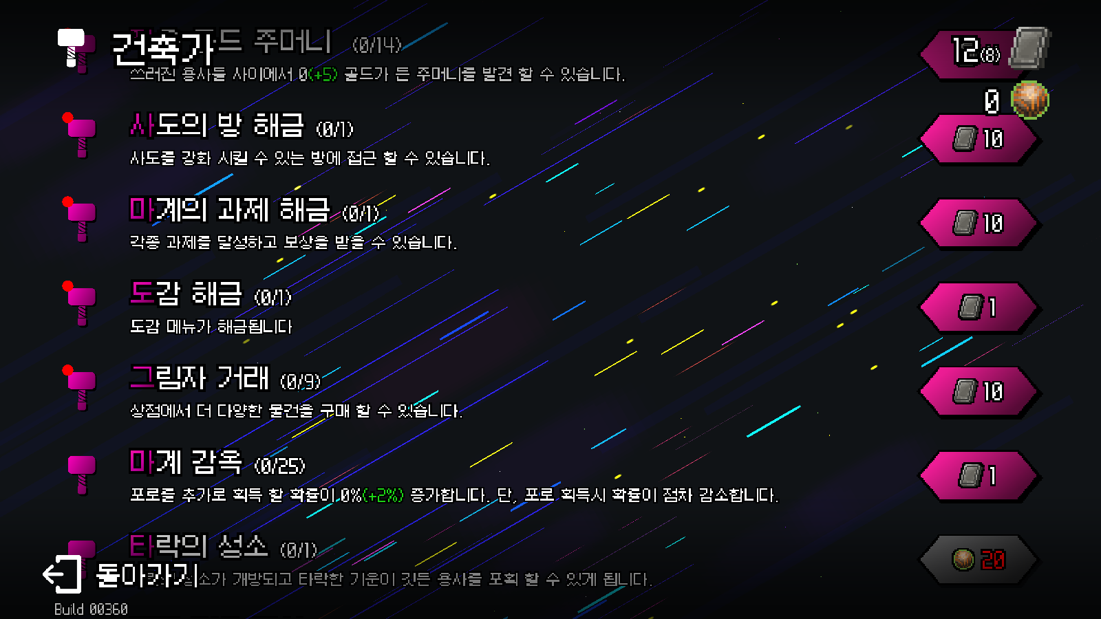 첫 게임 클리어 시 [빛의 인도석 해금 / 수송석 / 심연의 건축가 / 동원령 / 힘의 순환] 항목이 추가됩니다.