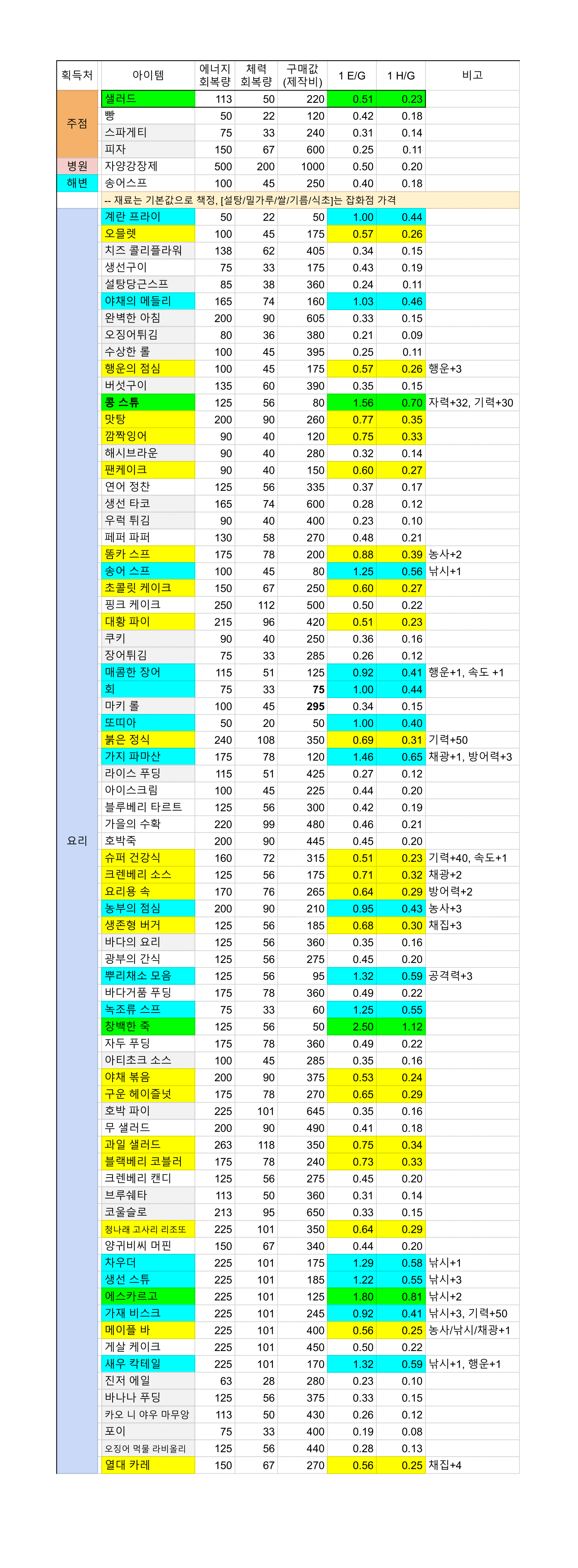 즉 에너지 회복량 / 구매 가격 (E/G)이 0.51 이상, 체력 회복량 / 구매 가격 (H/G) 0.23 이상인